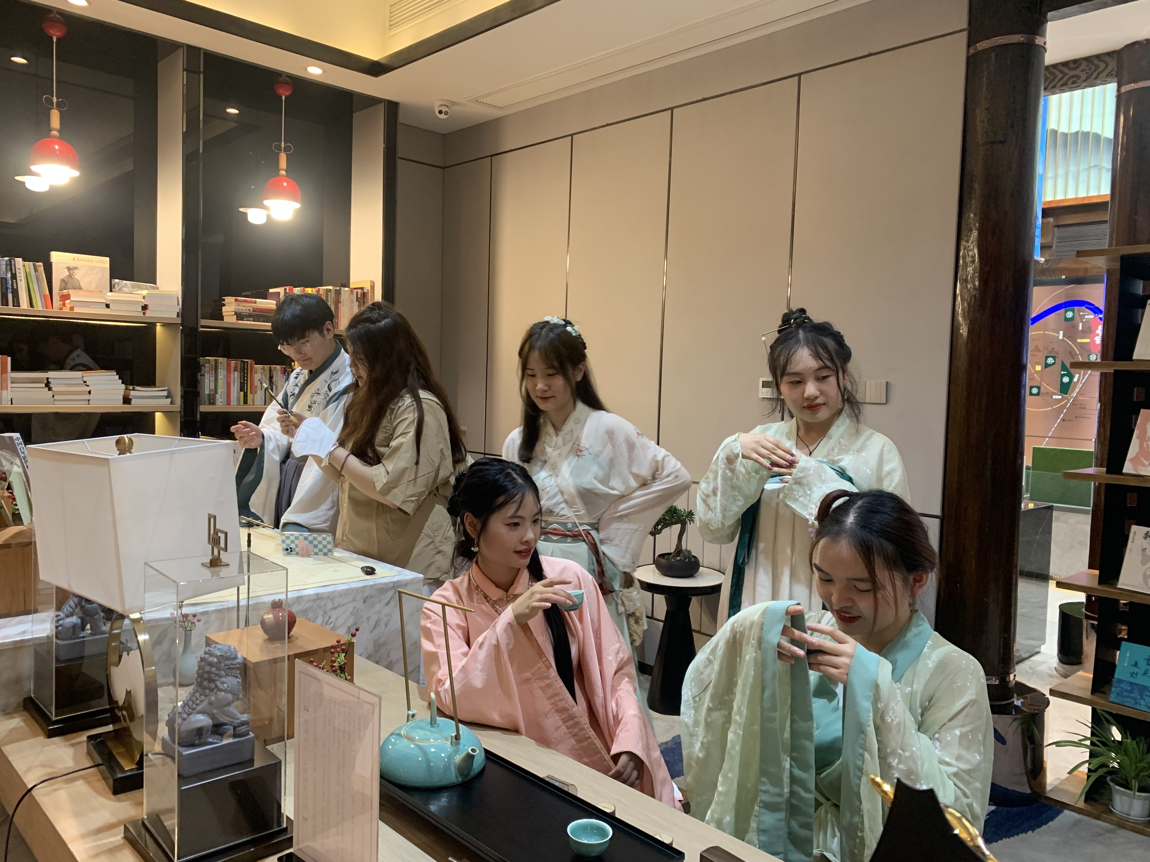 图1:着汉服的志愿者在老街文创工坊展示茶艺