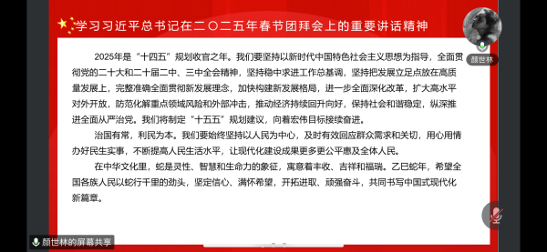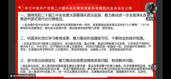 今天的主题党日共有五项内容,一是学习习近平总书记在二十届中央纪委四次全会的重要讲话精神;二是学习习近平总书记在二〇二五年春节团拜会上的重要讲话精神;三是学习中国共产党第二十届中央纪律检查委员会第四次全体会议公报;四是学习2025年全国教育工作会议精神;最后是结合学习和工作实际交流研讨。