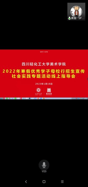 1月18日下午,美术学院通过腾讯会议召开2022年寒假优秀学子母校行招生宣传社会实践专题活动在线指导会,美术学院副院长黄磊、党委副书记肖雷、学术办主任邓婷尹、学工办主任郭化丽和近120位参与寒假招生宣传的同学参加了会议。会议由美术学院组织员唐金文主持。