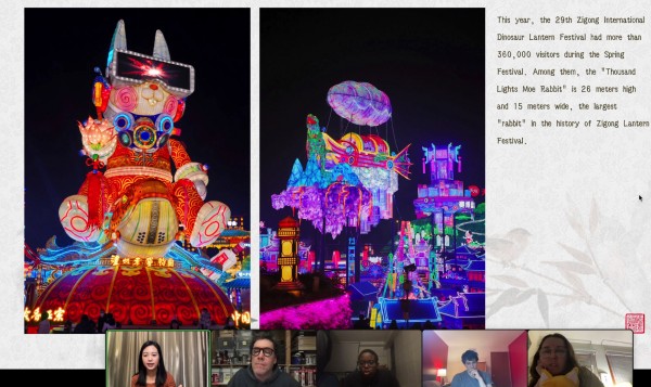 张琪首先介绍四川轻化工大学基本情况,其次介绍美术学院的学科专业设置和学术研究特色。然后,根据自身专业实践经验和研究成果,重点介绍自贡彩灯非遗文化传承、发展现状。其后,深入浅出地分析自贡彩灯创新发展的主要原因,并分享了彩灯文创设计知识。师生们距离虽远隔万里,课堂气氛仍依然活跃。强大的数字技术为中美文化和教育交流搭建着友好的桥梁。在互动提问环节,讨论积极热烈。同学们针对自贡彩灯的材质选择及中国文字与英文字母设计区别等疑惑提出具体问题,张琪通过网络详细解答。课程临近结束,张琪总结课程内容并欢迎大家来中国自贡和四川轻化工大学学习、观灯。该门课程将持续到4月中旬,张琪将按时在线指导圣弗朗西斯大学学生以自贡彩灯为题创作艺术作品。