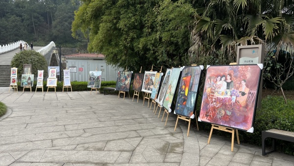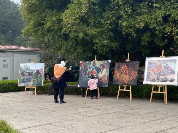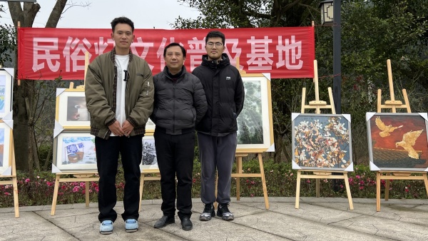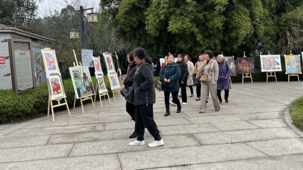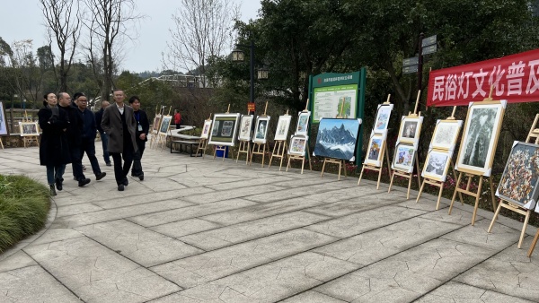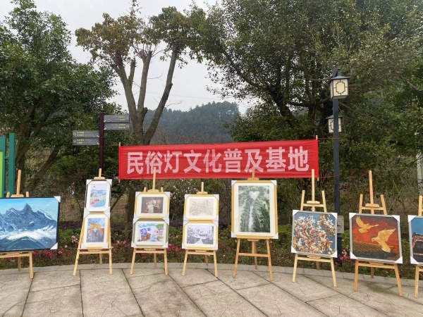 3月7日,民俗灯文化普及基地前往自贡市荣边镇尖山村“尖山风景区”举办美术作品展,助力自贡市自流井区二十三届自流井·尖山桃花会开幕式。50余件美术和设计作品摆放在景区内的枢纽位置,吸引了不少游客驻足观看。