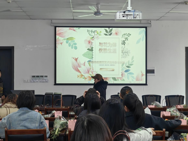 本次以“中国传统插花艺术的传承与创新”为主题的3.8节活动,邀请了花艺师雷老师讲解。雷老师从插花艺术的起源、花语、插花常用花材、东西方插花风格等方面进行讲解,并在现场进行了示范。