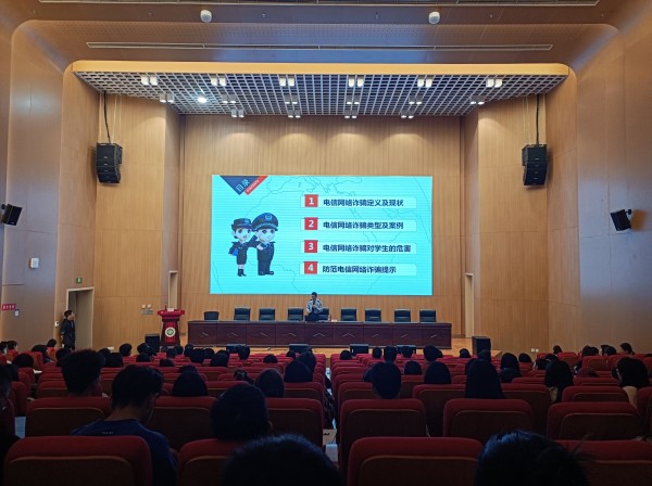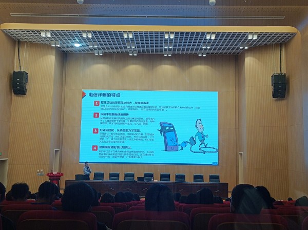 钱俊颖主讲题目为“为青春护航、建无诈校园”,内容围绕“电信网络诈骗定义及现状”“电信网络诈骗类型及案例”“电信网络诈骗对学生的危害”“防范电信网络诈骗提示”四个方面展开,强调了电信诈骗的特点、现状,怎样提高自身反诈能力等问题,提醒同学们时刻牢记网络诈骗“五不要”。驻校民警余志飞向同学们介绍了校园诈骗真实案例,指导师生们在日常生活中怎样有效建立防范意识。