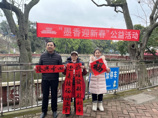 在彩灯公园人工湖畔人行道旁,师生们现场挥毫,为入园参加活动的社区群众书写“福”字和春联。红红的纸张和吉祥的话语引得路过的群众纷纷驻足观看。当得知为公益活动时,大家争先恐后,无不希望得到师生们的墨宝。3名学生一边维持持续、一边动笔书写,热烈的气氛感染着现场的每一个人。不少孩子们对此产生浓厚的兴趣,积极融入,执笔、落墨一展自己的才能。