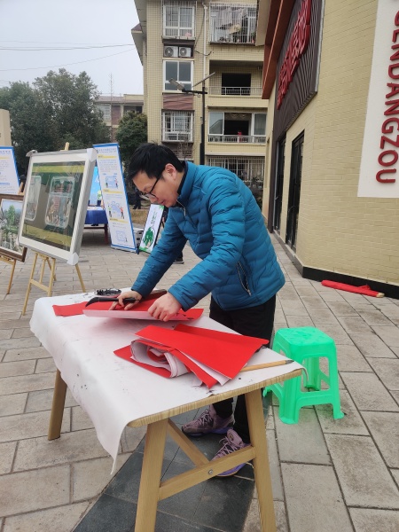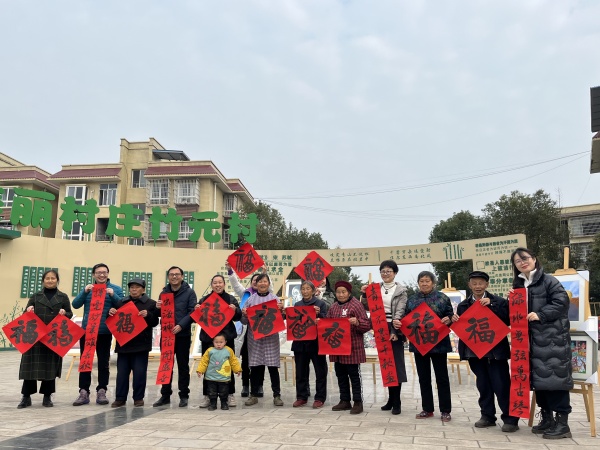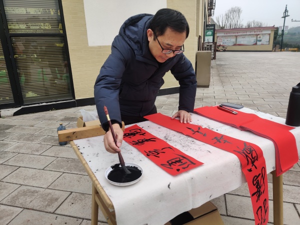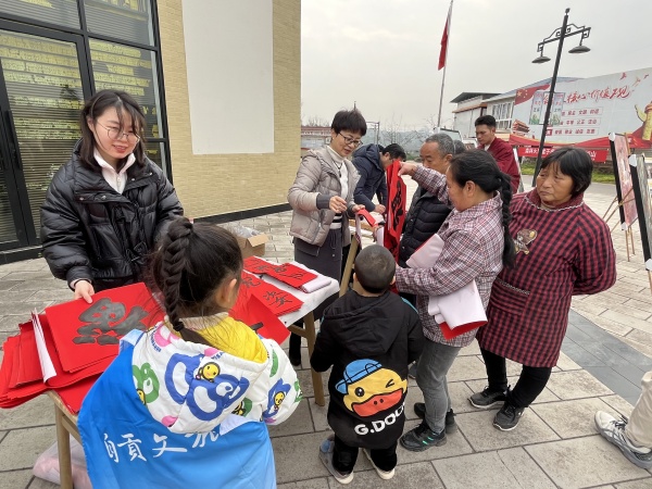 1月19日清晨,美术学院党委侯懿书记一行7人前往自流井区仲权镇竹元村开展送文化进乡村活动。上午9:00活动开始,在竹元村党群服务中心前的广场上,美术学院梁川教授和人文学院王益教授现场书写春联和“字”福,青年教师胡瑞琪协助侯懿书记将事前写好的春联和“福”字发放给村民们。