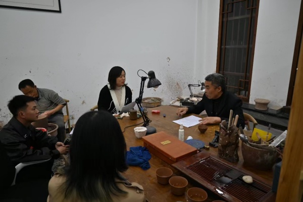 随后,考察队伍前往四川黄氏陶艺文化传播公司,拜访荣县土陶的省级非遗传承人黄斌先生。黄斌先生的工作室里排列着各种尺寸、形态不一的土陶制品,种类从一般生活器皿到雕塑、乐器,可谓琳琅满目、蔚为大观。黄斌先生为人淳朴和善,与学生师生们合围一桌亲切交谈。学生们就土陶的历史文化与非遗技艺等问题向黄斌先生请教。他耐心细致地回答每一个问题,使师生们加深了对荣县土陶发展历史、制作技艺和艺术价值的认知。