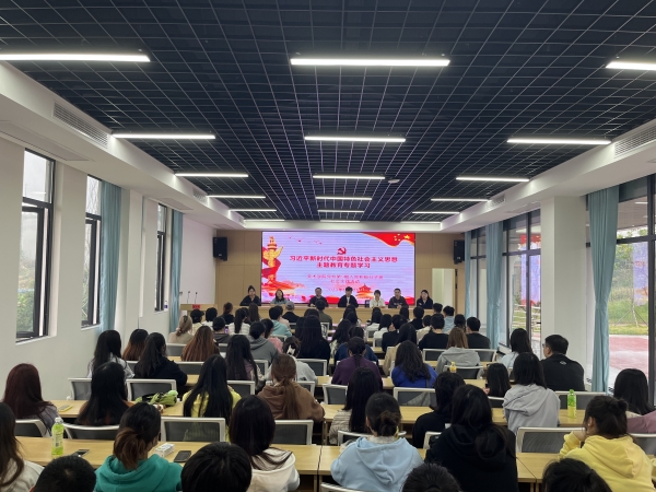 第三部分,师生一行在江姐大讲堂集中开展学习贯彻习近平新时代中国特色社会主义思想主题教育专题学习活动,集中学习习近平总书记《论党的青年工作》一书的篇章简介,领会习近平总书记重视青年工作、关心青年成长成才、指导青年干事创业的相关论述。