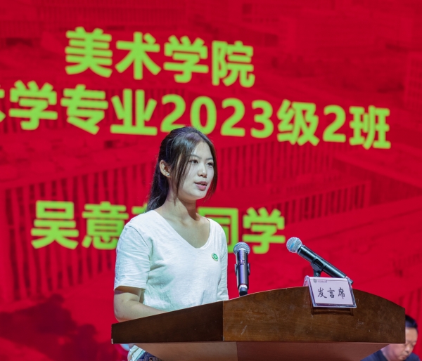 吴意茹代表2023级新生致辞,表示将以充沛的学习热情、扎实的学习态度、乐观的生活心态追求卓越,超越自我。
