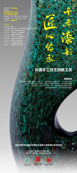 近年来,美术学院深入挖掘区域文化特色、紧跟时代步伐,立足区域优势,打造学科特色,提升办学质量。依托《手工艺造型》课程,美术学院将持续开展“非遗大师进校园”特色学术活动。本次“千年漆艺·匠心传承”非遗手工技艺工坊课程将持续到六月底,是美术学院学科建设与研究生培养十周年巡礼系列活动之一。