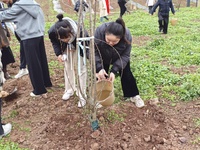 下午四点左右,在美术学院党委书记侯懿带领下,大家从学校步行到江姐村植树地点,每个支部负责植一棵树,同志们积极投入到植树活动中,取工具、提水、扶树苗、栽种、覆土、浇水、固根,既比速度,也比质量,干的热火朝天。树植好后,大家还在树枝上系上红布条,点缀装饰一番。各支部表示,植树只是第一步,后面还要加强养护,确保树木茁壮成长。