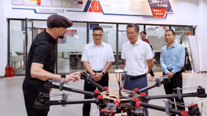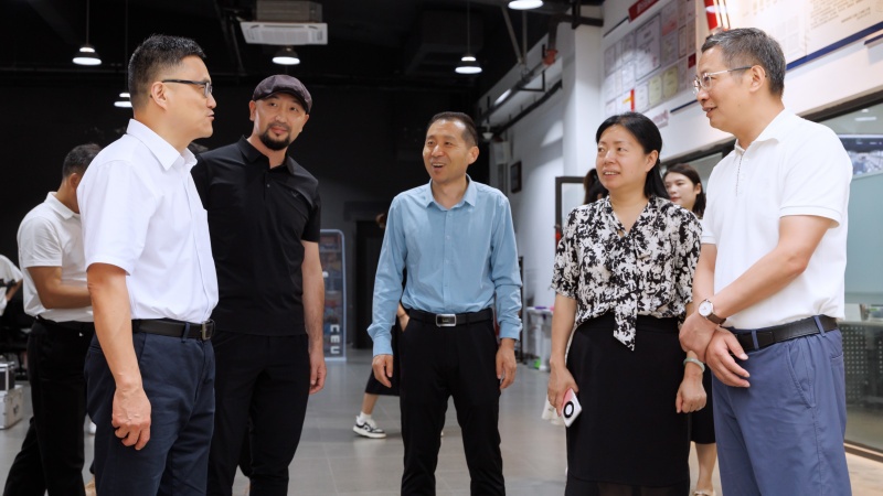 随后,彭闯一行前往“黄磊新媒体技能人才创新工作室”,深入了解工作室在数字媒体、艺术创作与新媒体技术融合领域的探索成果。黄磊介绍了工作室所获成果及新媒体艺术项目,并汇报了团队在服务地方文化产业发展、推动校企合作等方面的实践。彭闯对工作室“以技术赋能艺术,以创新服务社会”的理念表示肯定,强调技能人才是推动高质量发展的重要力量,勉励团队继续发挥专业优势,培养更多复合型新媒体人才。