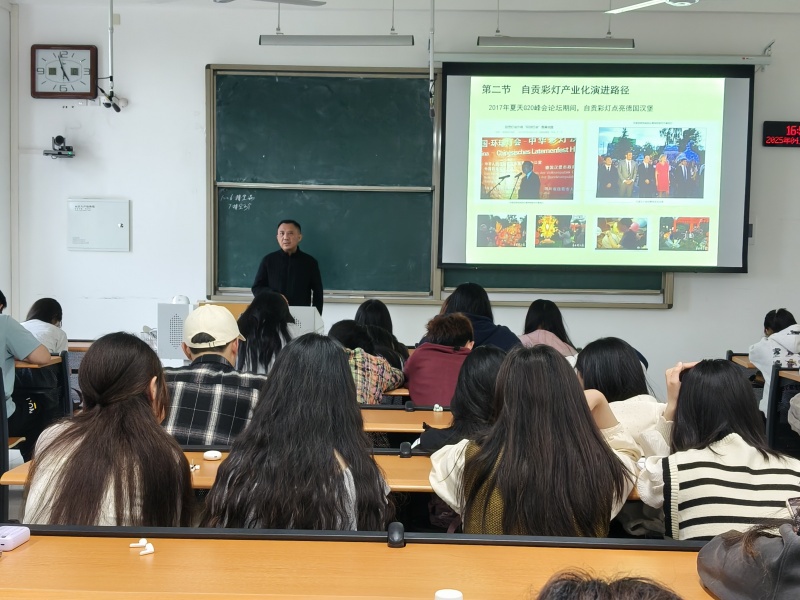 讲座由美术学院副院长、“彩灯设计与文化传播协会”指导教师梁川教授主讲。他围绕自贡灯会的历史源流、产业化发展进程、艺术特色与创意设计,以及经典作品赏析四个方面展开,系统阐述了自贡彩灯的文化内涵与艺术魅力。