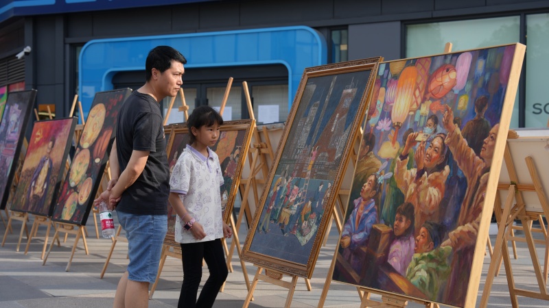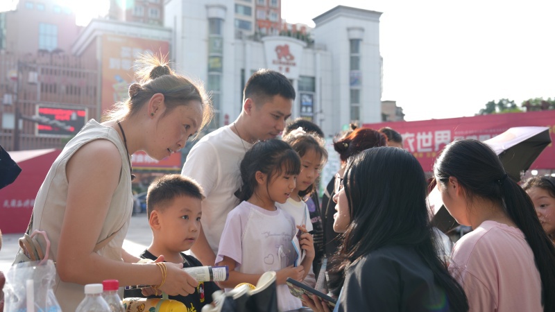 60余件美术和设计作品陈列在梵华商业综合体入口处的市民广场上,吸引众多前来购物、就餐的市民驻足欣赏。与此同时,画团扇、送团扇活动也火热开展。从18:00开始,至19:30天色渐暗时结束,在基地副主任梁川的带领下,志愿者们向过往市民发放彩灯文化宣传单300余份,赠送团扇80余柄。