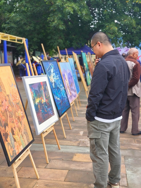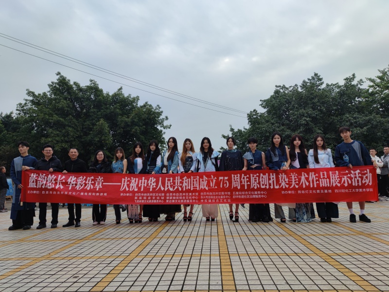 在活动现场,美术学院学生社团——“大学生艺术协会模特队”为前来参加活动的群众带去了《蓝韵悠长 华彩乐章》扎染服装秀特色节目。利用乡镇群众前来观看节目表演的契机,民俗灯文化普及基地组织“彩灯设计与文化传播协会”学生社团成员在现场举办了“砥砺奋进 筑梦同心”——庆祝中华人民共和国成立75周年美术作品展(第二次展览),并向群众赠送中国画团扇120把。