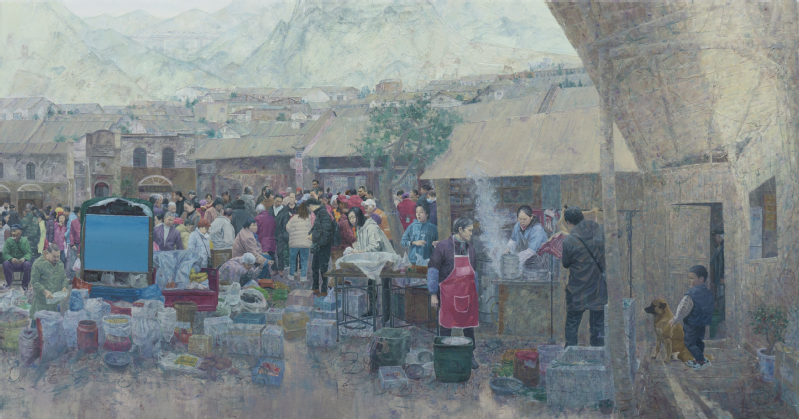 作品《盐都晨集图》以自贡盐业历史建筑和艾叶古镇为素材,通过对乡镇集市场景的细致描绘,展现出乡村振兴战略为基层群众生活带来的深刻变化。