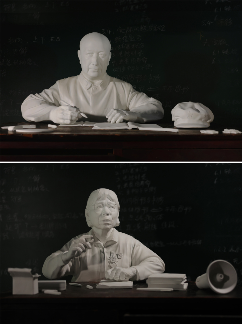 马俊的雕塑作品《国之脊梁·星辰与灯火》以“中国两弹一星功勋奖章获得者”钱学森和“燃灯校长”张桂梅的动人事迹为题,表现了他们爱党爱国、奉献牺牲,投身科学研究和教育事业的情景。三尺讲台、一张讲桌、几支粉笔,简洁有力的造型构建出科学研究、传播知识的伟大人格魅力。