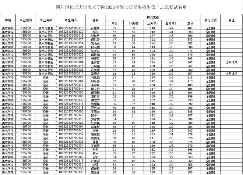 四川轻化工大学美术学院2026年硕士研究生招生第一志愿复试名单