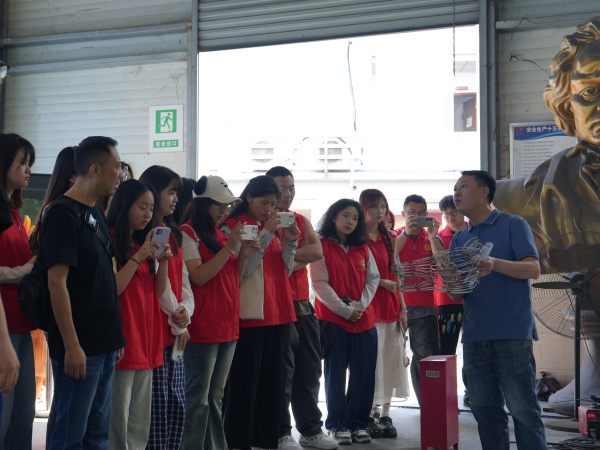 5月11日上午,美术学院副院长梁川带队前往自贡灯彩文化产业集团有限公司交流,考察企业生产经营情况并同时开展访企拓岗工作。彩灯设计与文化传播协会20余名大学生志愿者和彩灯艺术教研室青年教师樊成参加考察活动。