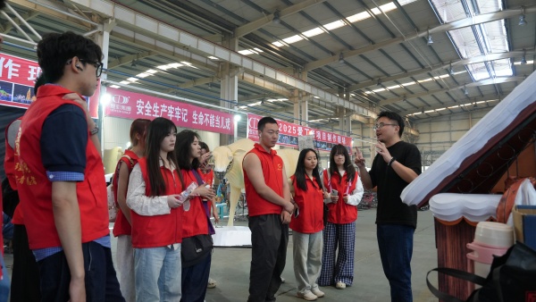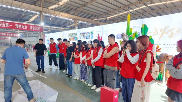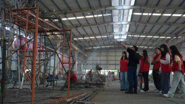 自贡灯彩文化产业集团有限公司是“中国彩灯学院”共建单位,是美术学院的专业实习实践基地,也是自贡彩灯走向世界的代表性企业。在参观过程中,梁川一方面了解企业目前海外项目生产进度,一方面向学生们介绍彩灯生产工艺流程,使大家对自贡彩灯形成更为深入的认识。企业管理人员一方面介绍项目推进情况,一方面强调安全生产意识。在生产车间内,法国图瓦里、英国朗利特等地区的灯展项目正在紧张有序地推进,彩灯艺术教研室青年教师樊成在现场组织教学,向同学们分析校内课堂设计方案落地实施原则,近三小时的参观学习活动为师生们带来许多收获。